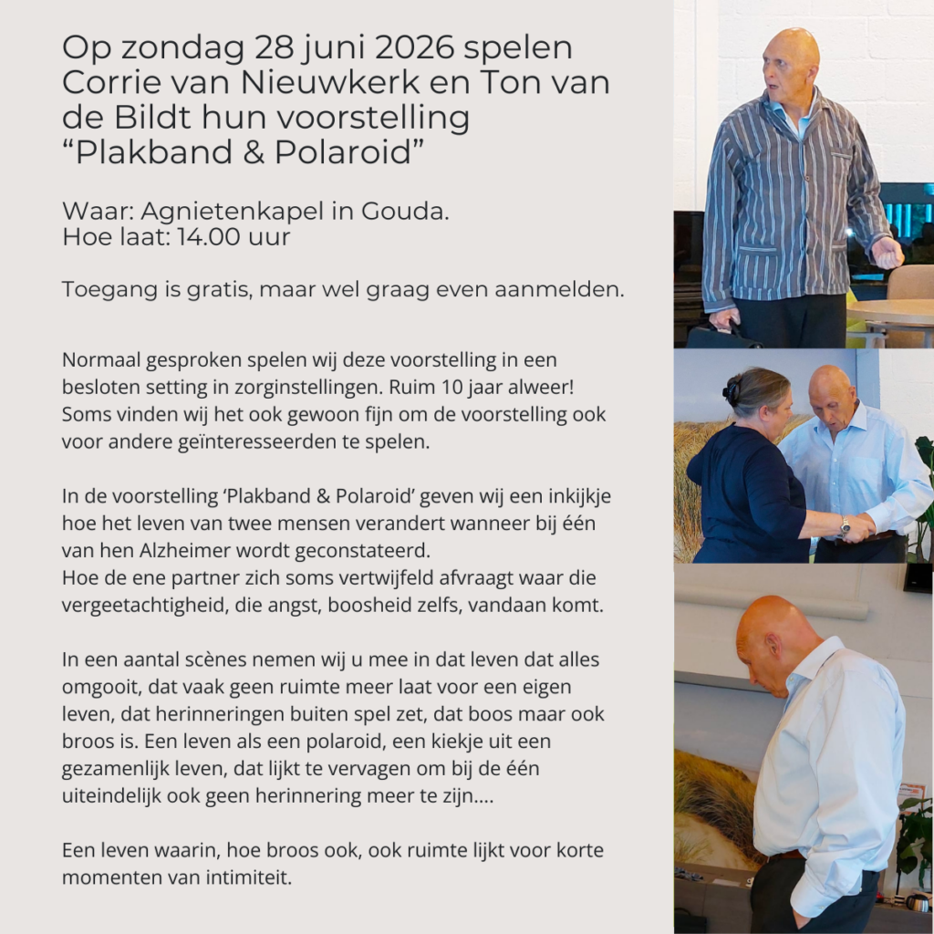 Na afloop van de voorstelling (circa 30 minuten) is er altijd een nagesprek. Soms over de voorstelling zelf. Of over dementie. Over persoonlijke ervaringen. Over mantelzorgen of jouw naaste met dementie. Zomaar weer ‘naar buiten stappen’ doen we nooit. Het nagesprek varieert, ook in tijd. We reserveren daar meestal een uur voor.